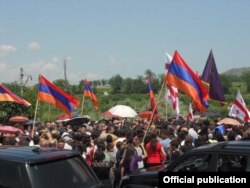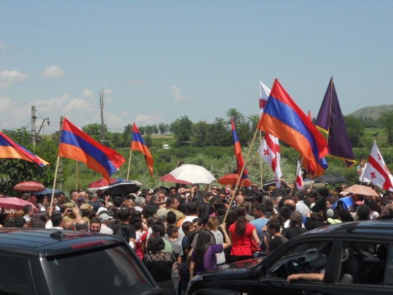 Georgia - Hundreds of people welcome the supreme heads of the Georgian and Armenian churches at the Georgian-Armenian border, 10Jun2011.