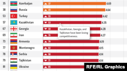 ԵՏՄ մյուս երկրներից՝ Հայաստանը 73-րդ տեղում է, Ղրղըզստանը՝ 102: ԵՏՄ անդամ Բելառուսի տնտեսությունը զեկույցում չի դիտարկվել: