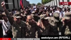 Այսօր Երևանում բողոքի երթ անցկացնող ուսանողներին Խանջյան փողոցում միացան զինվորական համազգեստով շուրջ երկու տասնյակ երիտասարդներ, նրանց հետ է նաև ավելի տարեց՝ փոխգնդապետի կոչումով մի սպա, ով ձեռքում պարզել է հայկական եռագույնը: