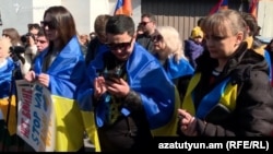 Հայաստանում Ուկրաինայի դեսպանատան առջև ուկրաինացիներն իրենց հիմն են երգում` «դադարեցրեք պատերազմը», «ո՛չ պատերազմին» պաստառները պարզած: