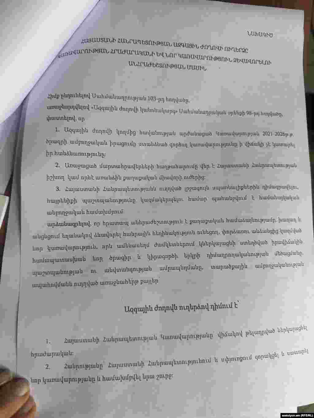 Խորհրդարանական ընդդիմության ներկայացրած միջնորդության տեքստն՝ ամբողջությամբ