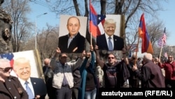 ԱՄՆ նախագահ Դոնալդ Թրամփի ու «Դոգ» մականունով հայտնի նախկին ռազմական ոստիկան Վարդան Ղուկասյանի մեծ դիմանկարներով ցույց Երևանում ԱՄՆ դեսպանատան դիմաց: Օվկիանոսից այն կողմ կալանավորված Ղուկասյանի աջաիկցները նրա նկատմամբ արդար դատաքննություն են պահանջում: